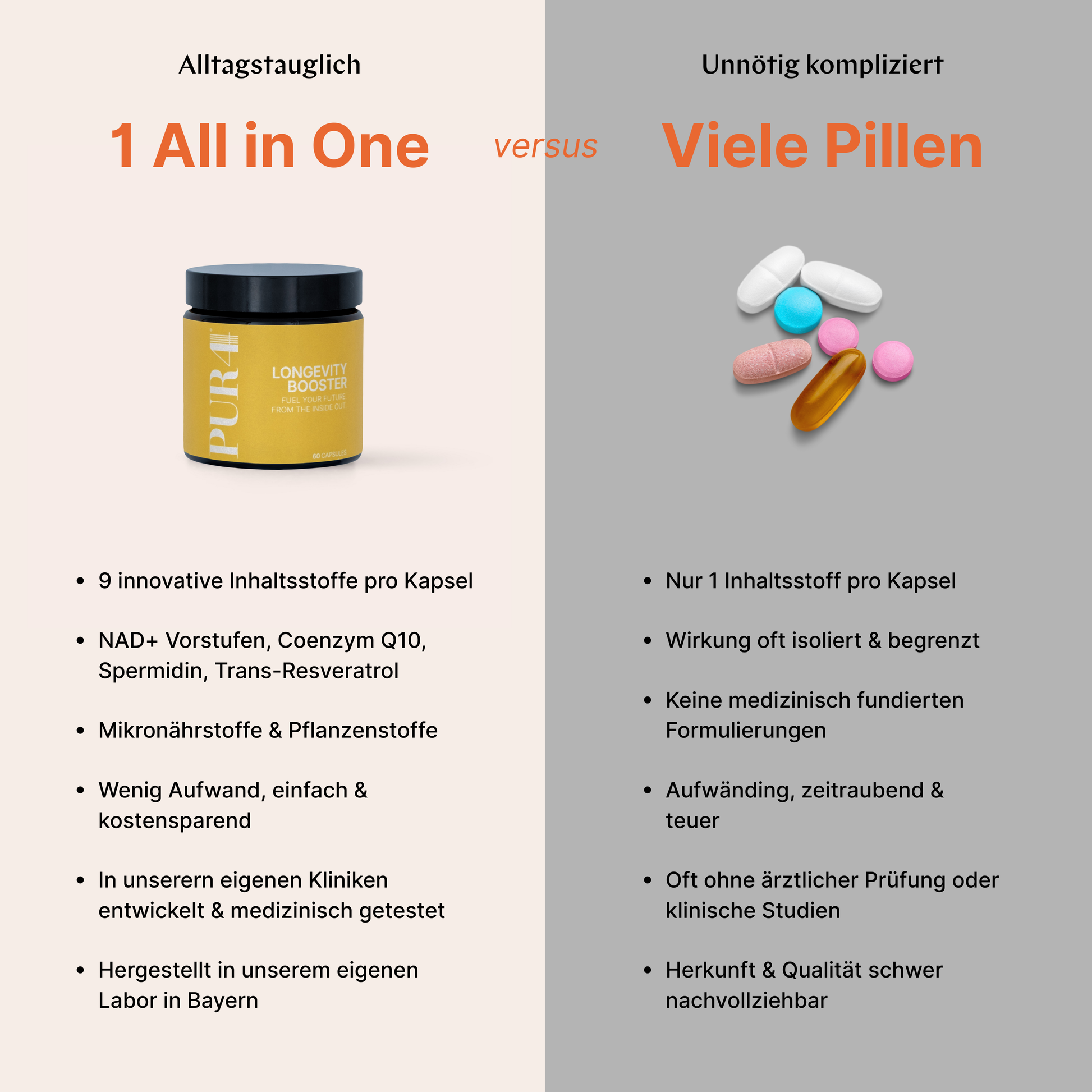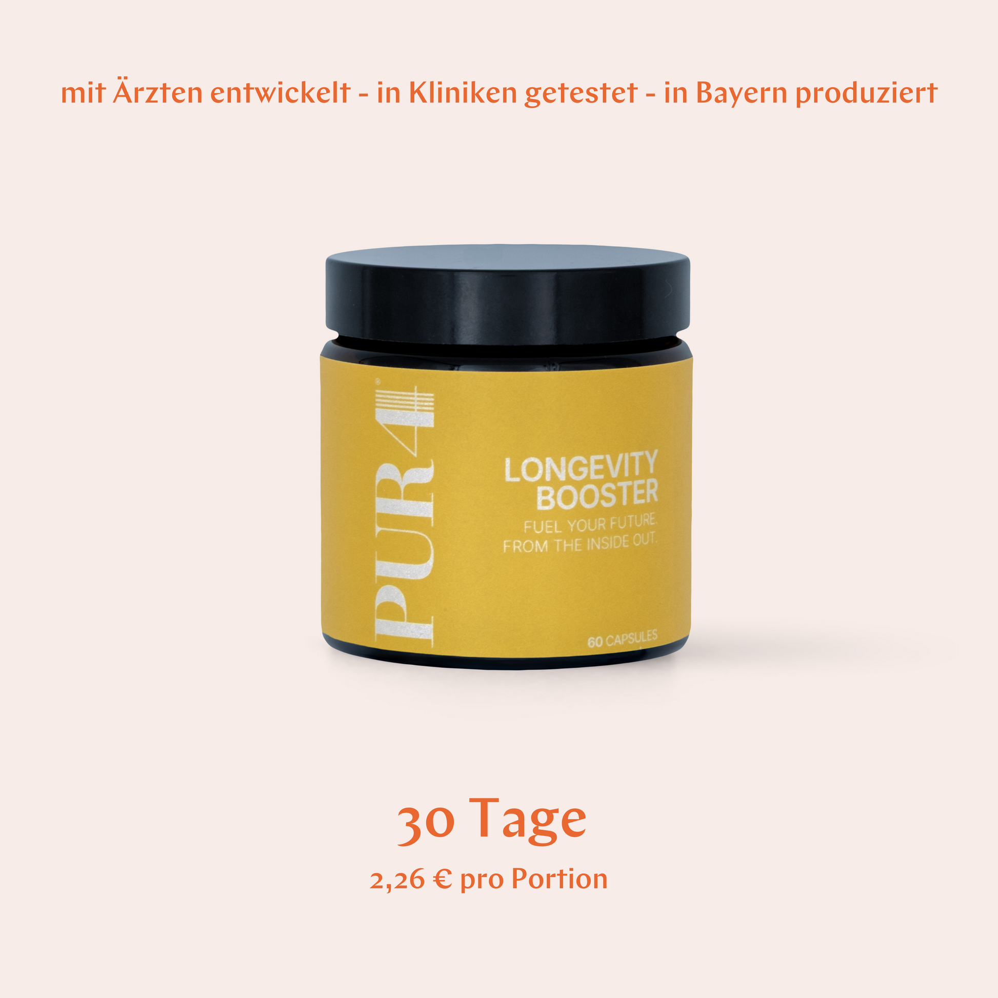 ThePUR4 LONGEVITY BOOSTERwas developed for everyone who wants to specifically support their body with high-quality micronutrients and bioactive substances as part of a modern longevity routine. The focus of the formula is on selected ingredients such as...Nicotinamide Riboside (NR)– a NAD⁺ precursor – as well asCoenzyme Q10,Alpha-lipoic acid,SpermidineandTrans-Resveratrol.
