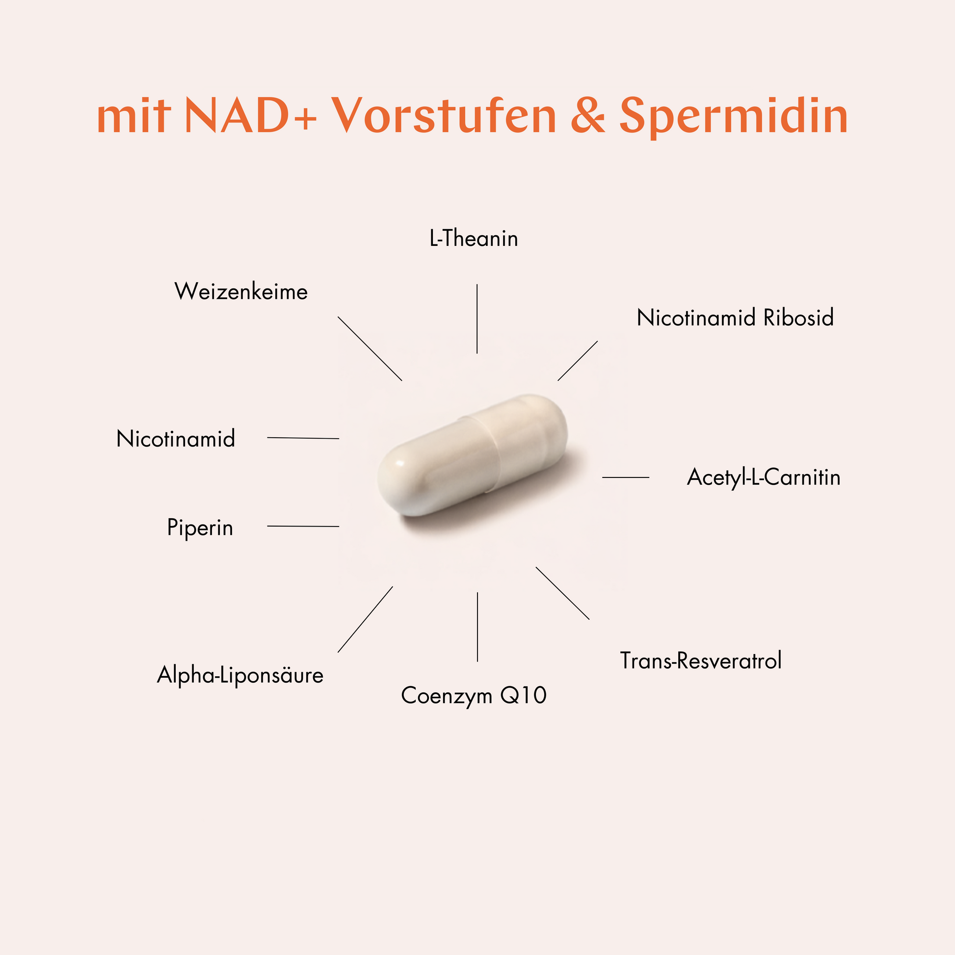 Nicotinamid Ribosid (NR), Acetyl-L-Carnitin, Trans-Resveratrol, Coenzym Q10, Alpha-Liponsäure, L-Theanin, Weizenkeime (Spermidin), Nicotinamid, Piperin