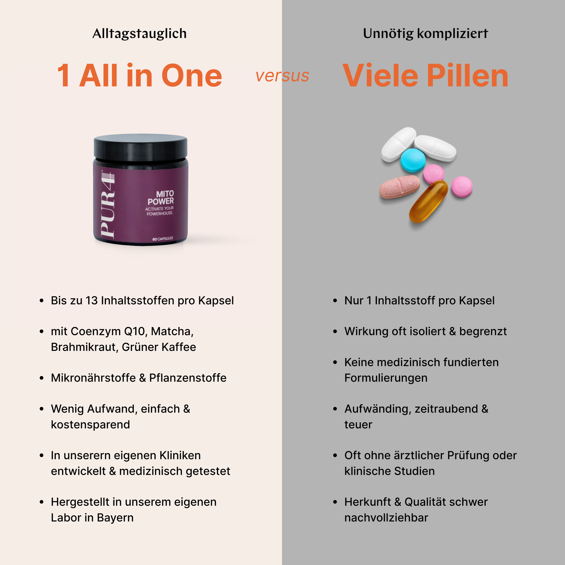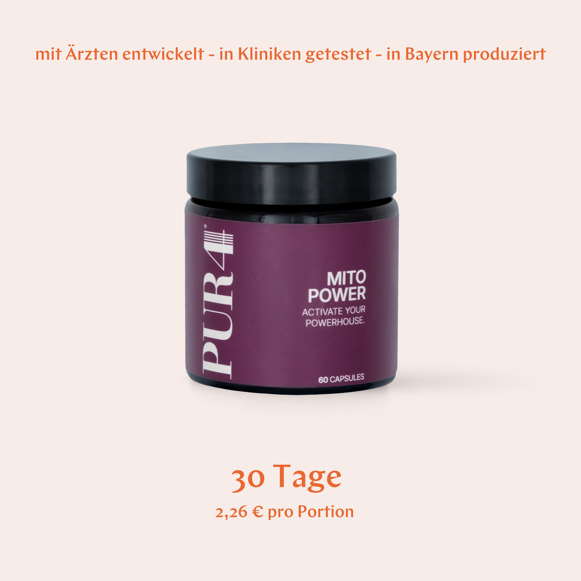 PUR4 MITOPOWER is designed to provide your body with exactly the nutrients needed for alertness, focus, energy, and mental clarity at the cellular level – without any artificial boost, but with a noticeable effect.