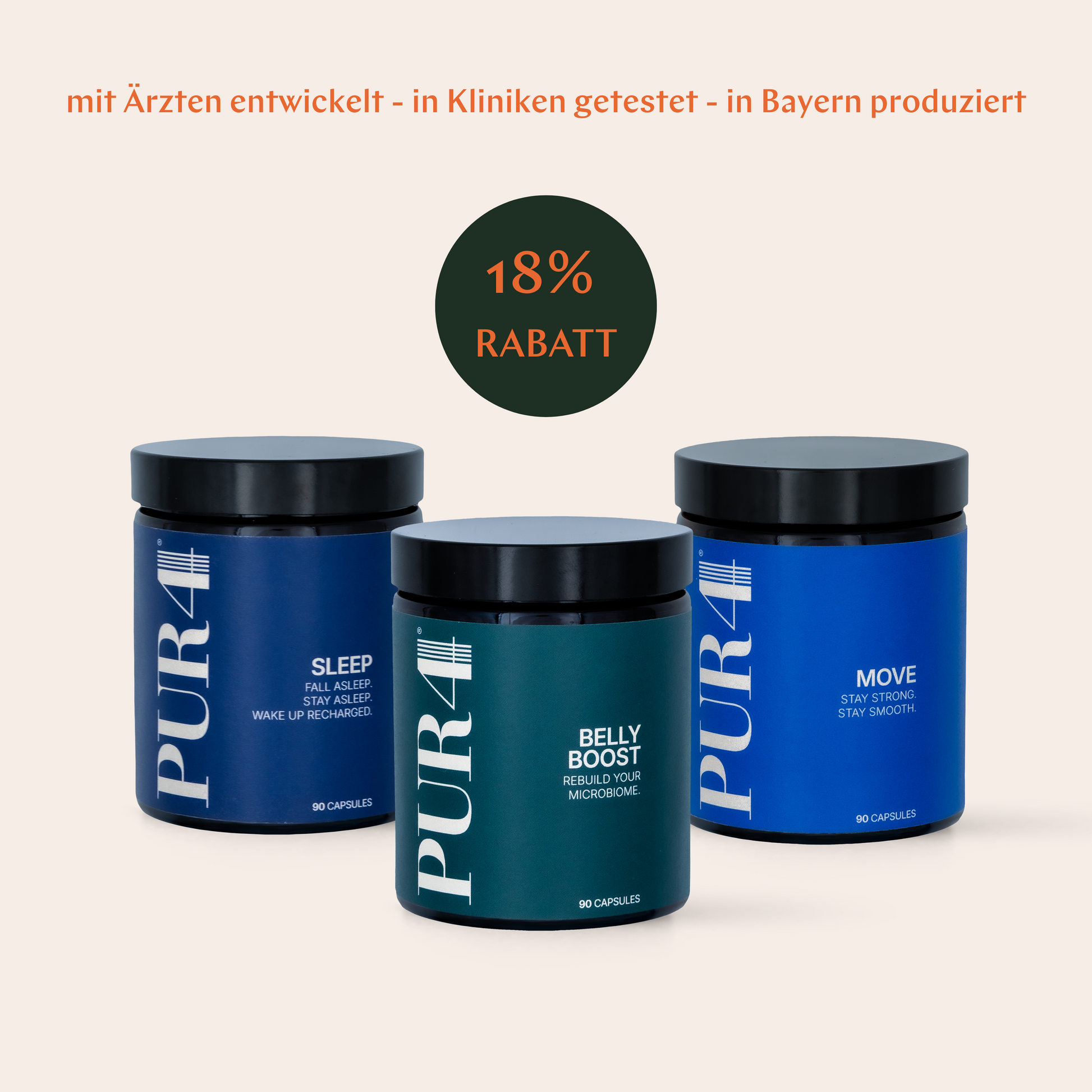 Das De-Stress Bundle vereint drei wirkungsvolle PUR4-Produkte – SLEEP, BELLY BOOST und MOVE – zur ganzheitlichen Unterstützung in stressreichen Zeiten. Es fördert Regeneration, Resilienz und die innere Balance auf körperlicher wie mentaler Ebene.