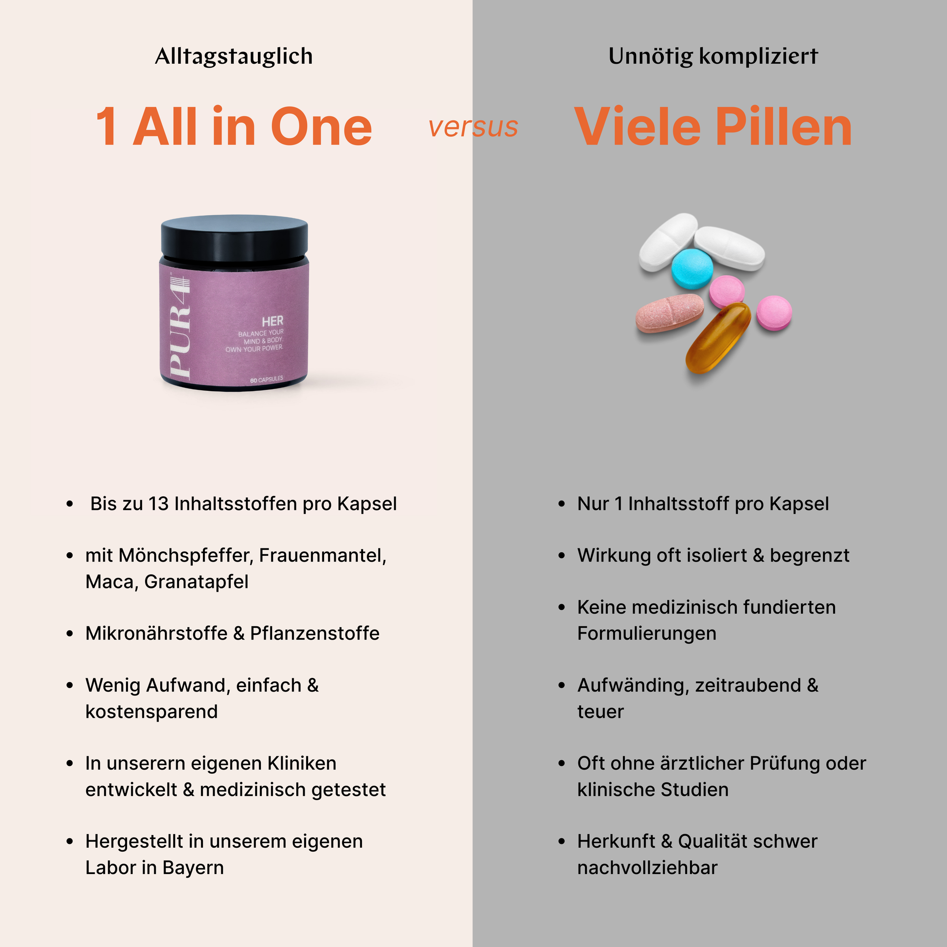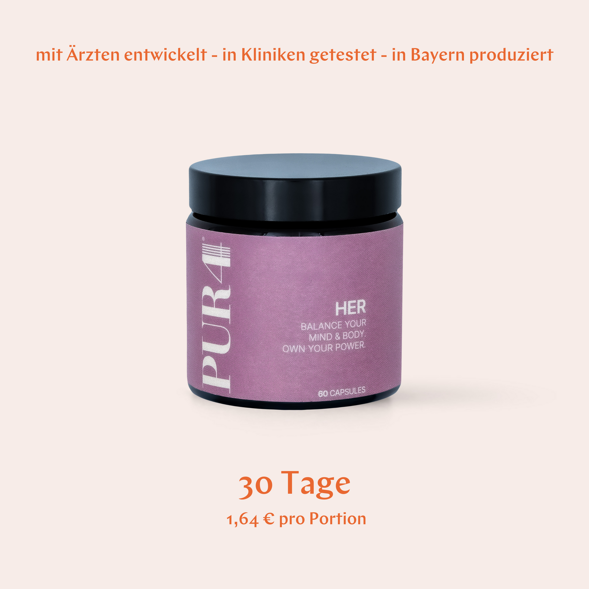 PUR4 HER ist ein Mikronährstoffkomplex, der speziell auf die Bedürfnisse von Frauen abgestimmt ist – inspiriert von ganzheitlichen Ansätzen rund um Energie, Wohlgefühl und innere Balance im weiblichen Alltag.