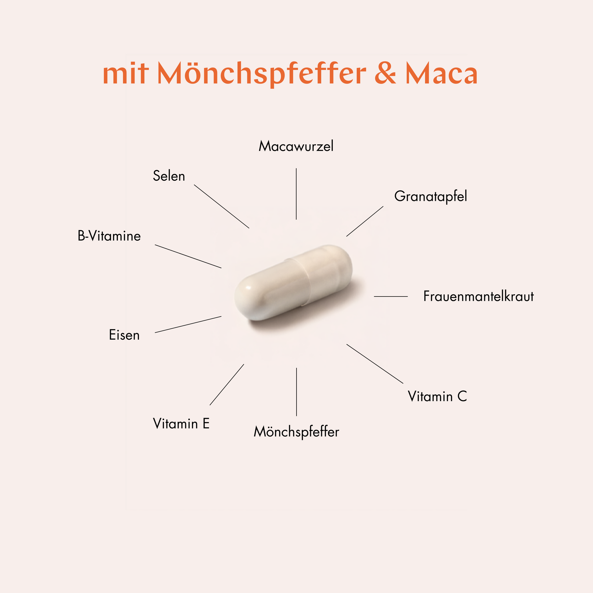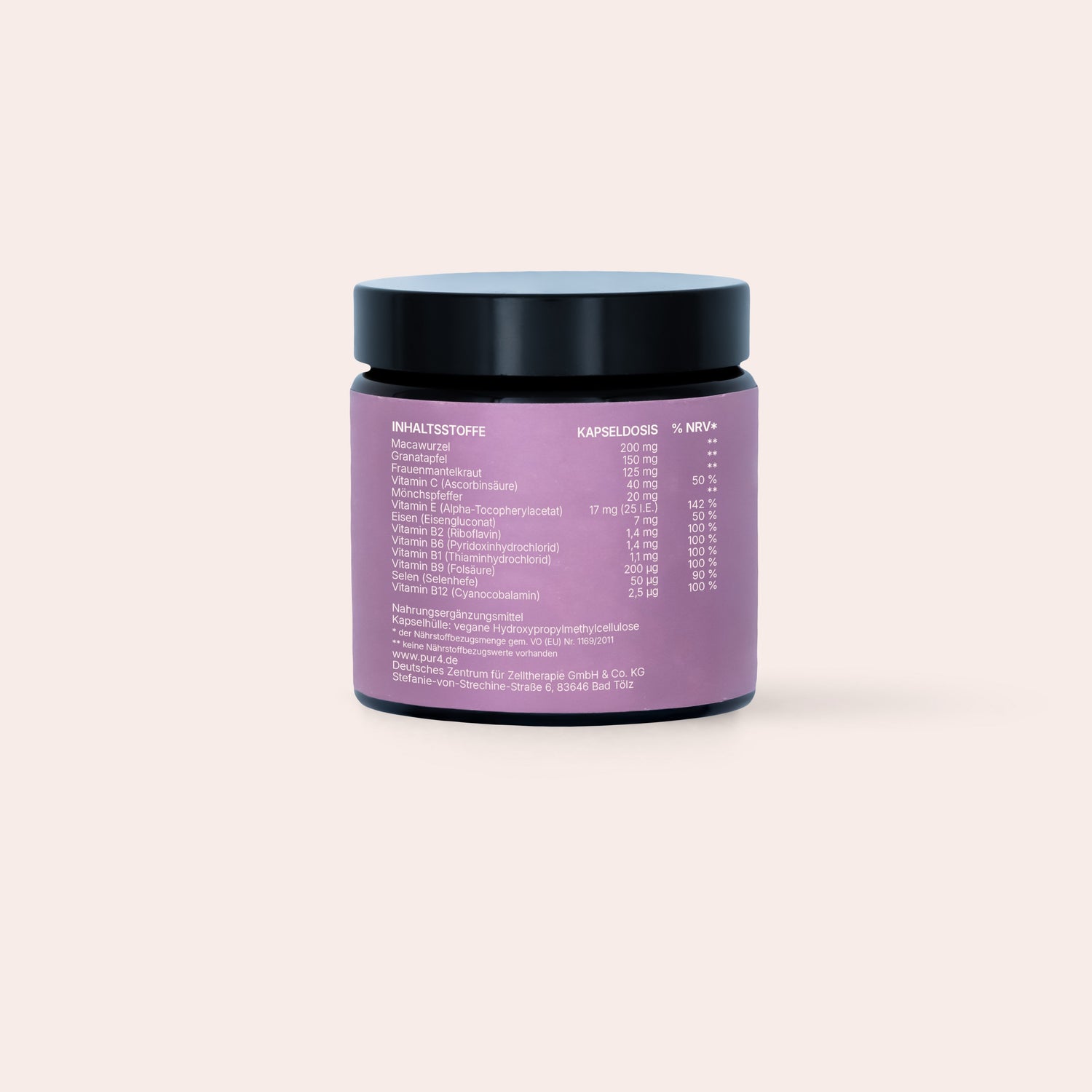 Die Formel kombiniert bewährte Pflanzenstoffe wie Macawurzel, Granatapfelextrakt, Frauenmantelkraut und Mönchspfeffer mit essenziellen Mikronährstoffen. Ergänzt wird das Produkt durch Eisen, Selen, Vitamin C sowie eine Auswahl an B-Vitaminen, die unter anderem zum normalen Energiestoffwechsel, zur Erhaltung normaler Haut und zur Funktion des Immunsystems beitragen.