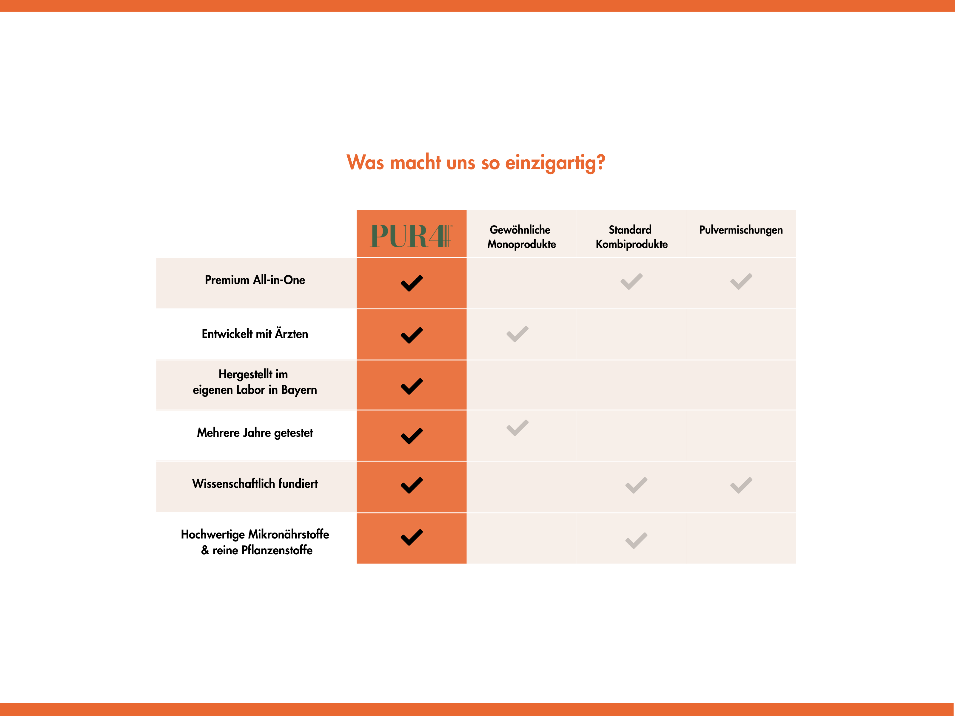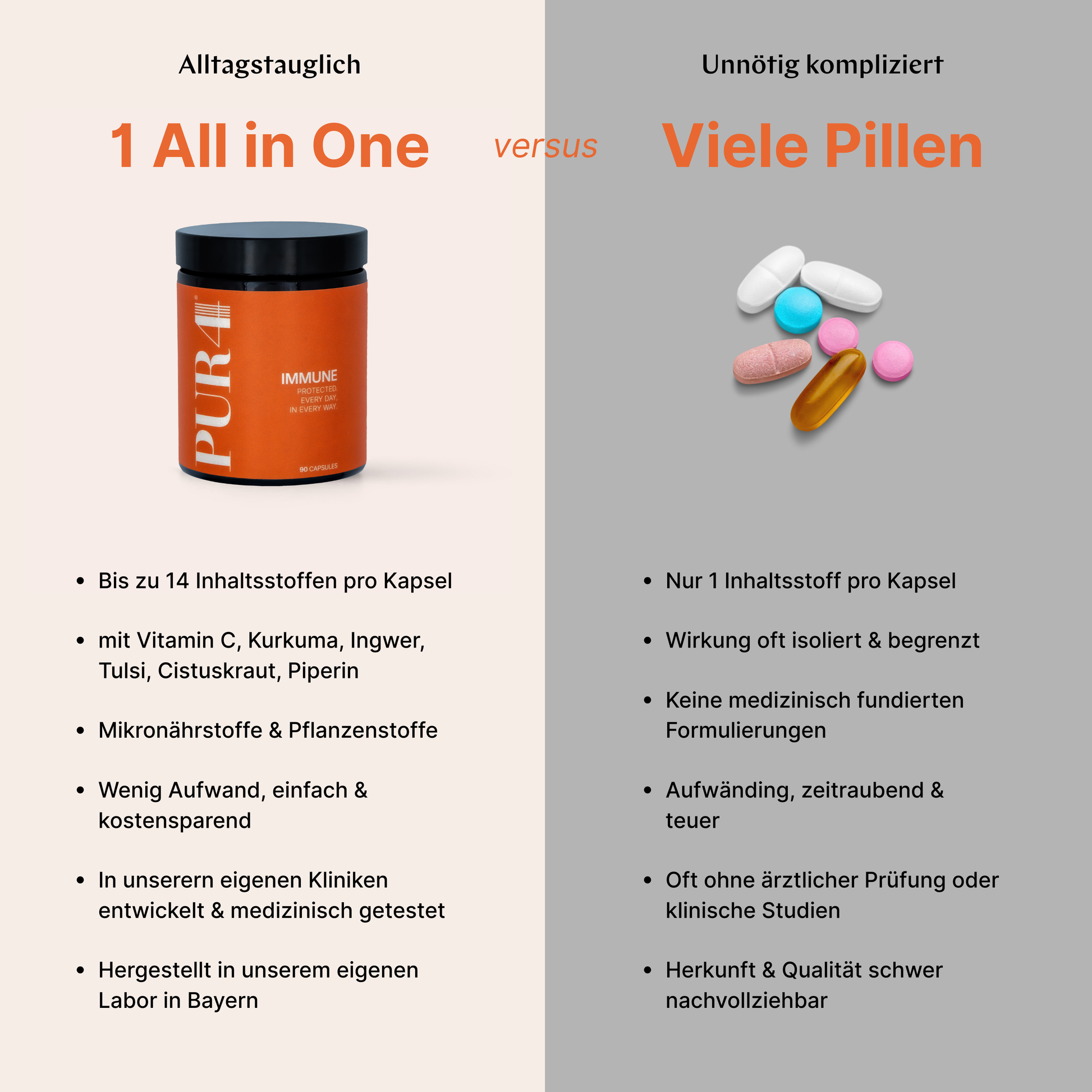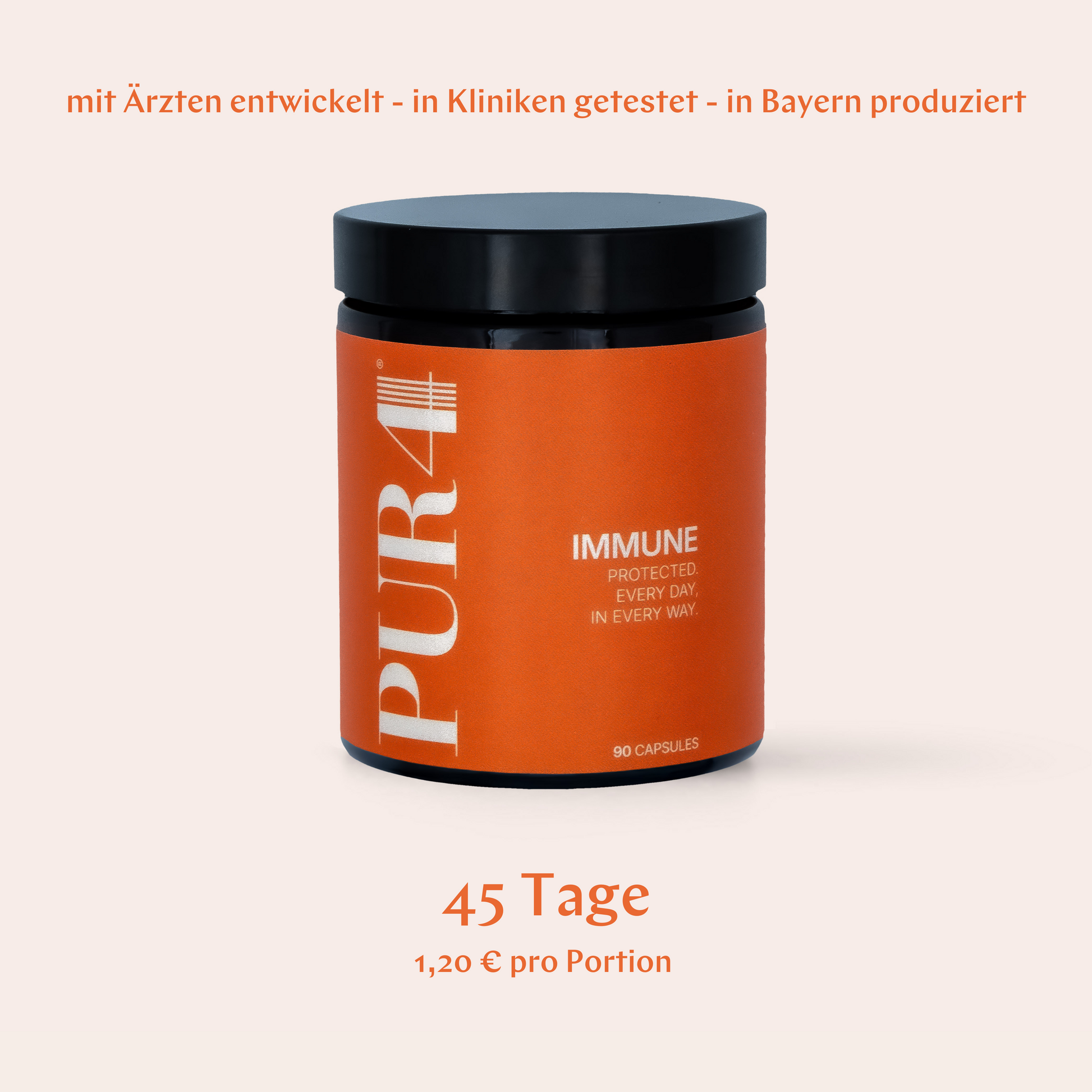 PUR4 IMMUNE ist eine hochwertige Kombination aus Vitaminen, Mineralstoffen und bioaktiven Pflanzenstoffen – entwickelt für alle, die ihr Immunsystem gezielt mit essenziellen Mikronährstoffen ergänzen möchten. Die sorgfältig abgestimmte Rezeptur basiert auf aktuellen wissenschaftlichen Erkenntnissen rund um Immunfunktion, Zellschutz und antioxidative Balance.