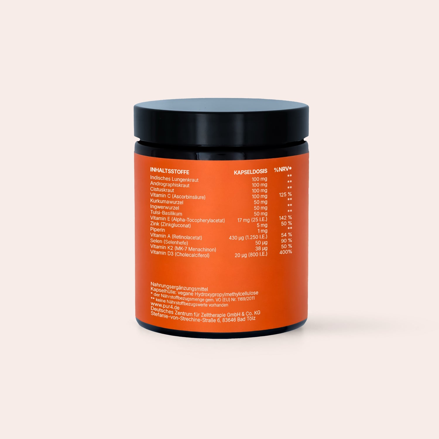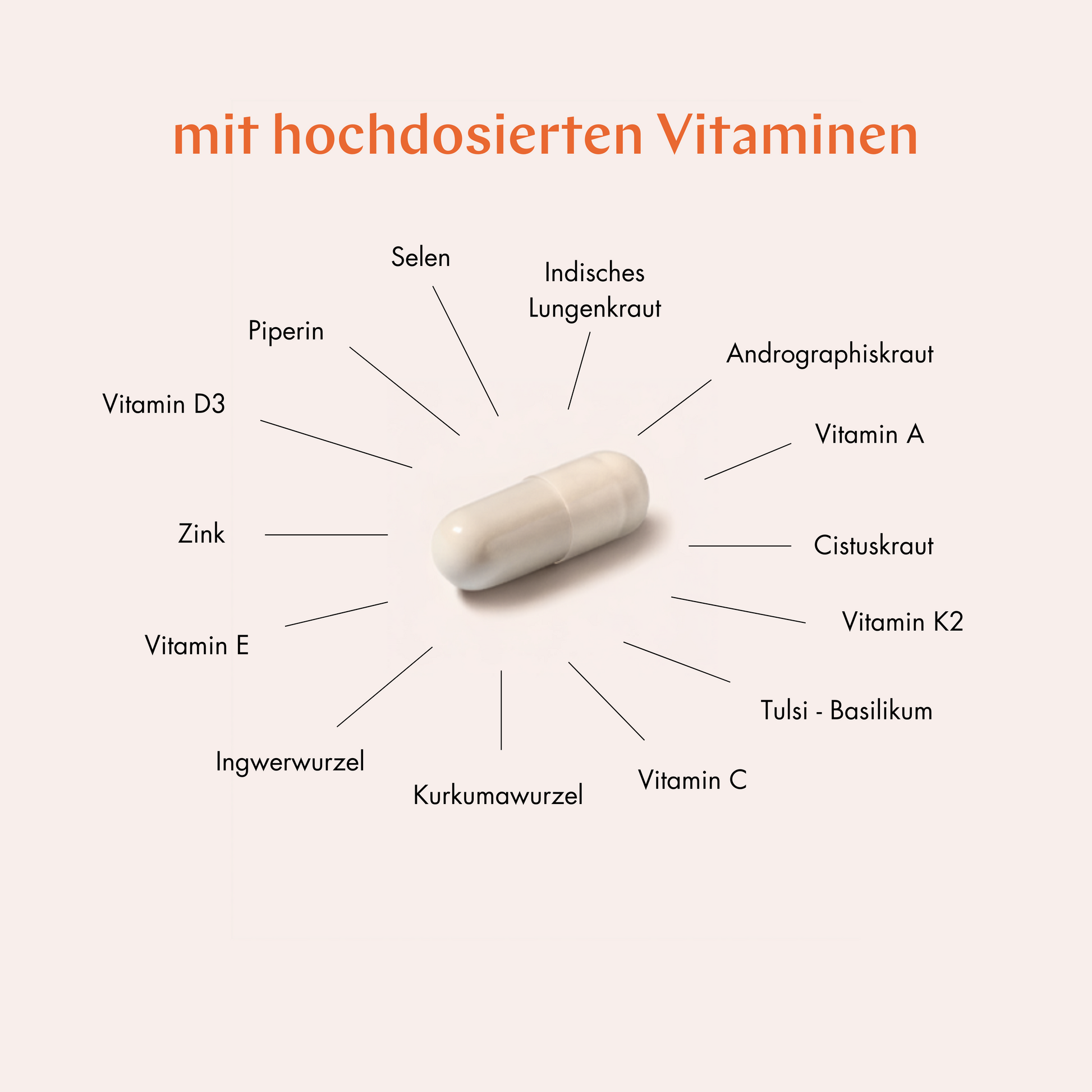 Enthalten sind wichtige Mikronährstoffe wie Vitamin A, C, D, E, K, Zink und Selen, die zur normalen Funktion des Immunsystems sowie zum Schutz der Zellen vor oxidativem Stress beitragen. Ergänzt wird die Formel durch ausgewählte Pflanzenstoffe – darunter Indisches Lungenkraut, Andrographis, Kurkuma, Ingwer, Cistus und Tulsi-Basilikum – bekannt für ihren Gehalt an sekundären Pflanzenstoffen wie Flavonoiden und Carotinoiden.
