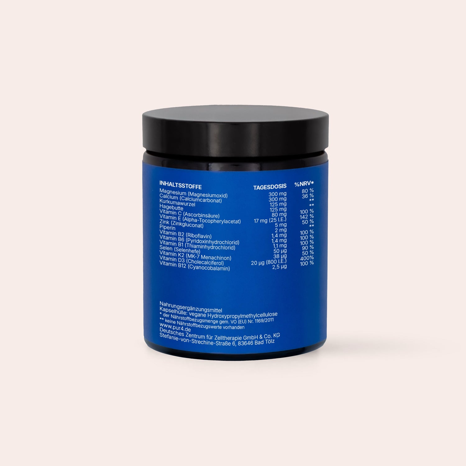 Magnesium, Calcium, Kurkumawurzel, Hagebutte, Vitamin C, Vitamin E, Zink, Piperin, Vitamin B12, Vitamin B6, Vitamin B1, Selen, Vitamin K2, Vitamin D3, Vitamin B12