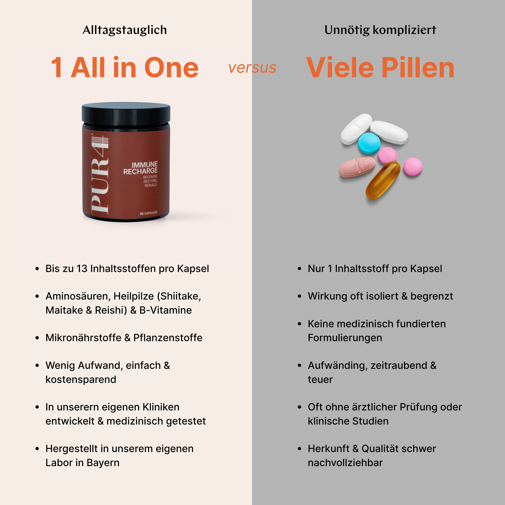 PUR4 RECHARGE geht über klassische Regenerationsprodukte hinaus. Während viele Supplements lediglich einzelne Mikronährstoffe oder kurzfristig wirkende Inhaltsstoffe enthalten, setzt PUR4 RECHARGE auf eine ganzheitliche, funktionell abgestimmte Formel – speziell für Menschen mit hohem mentalem und körperlichem Stresslevel.