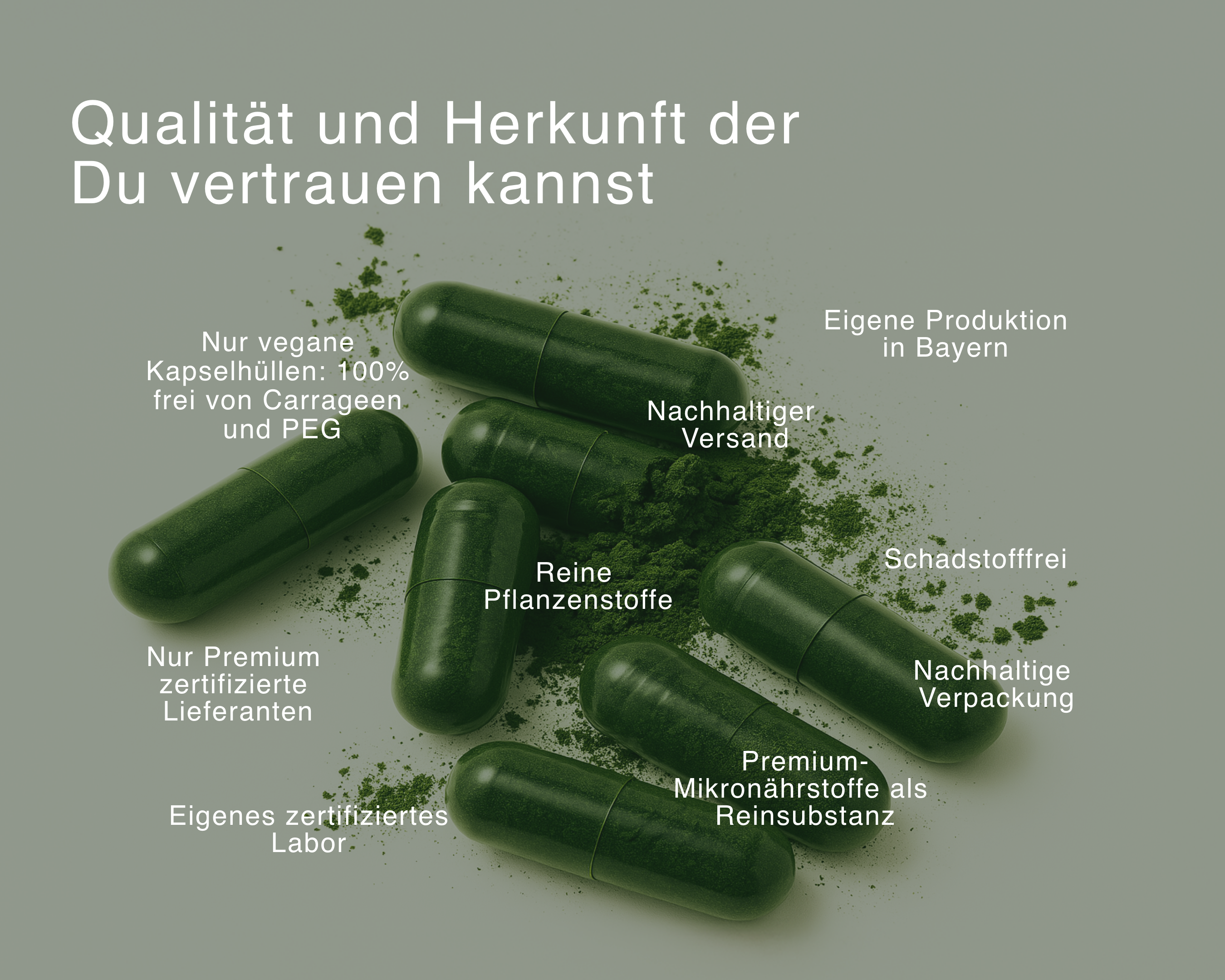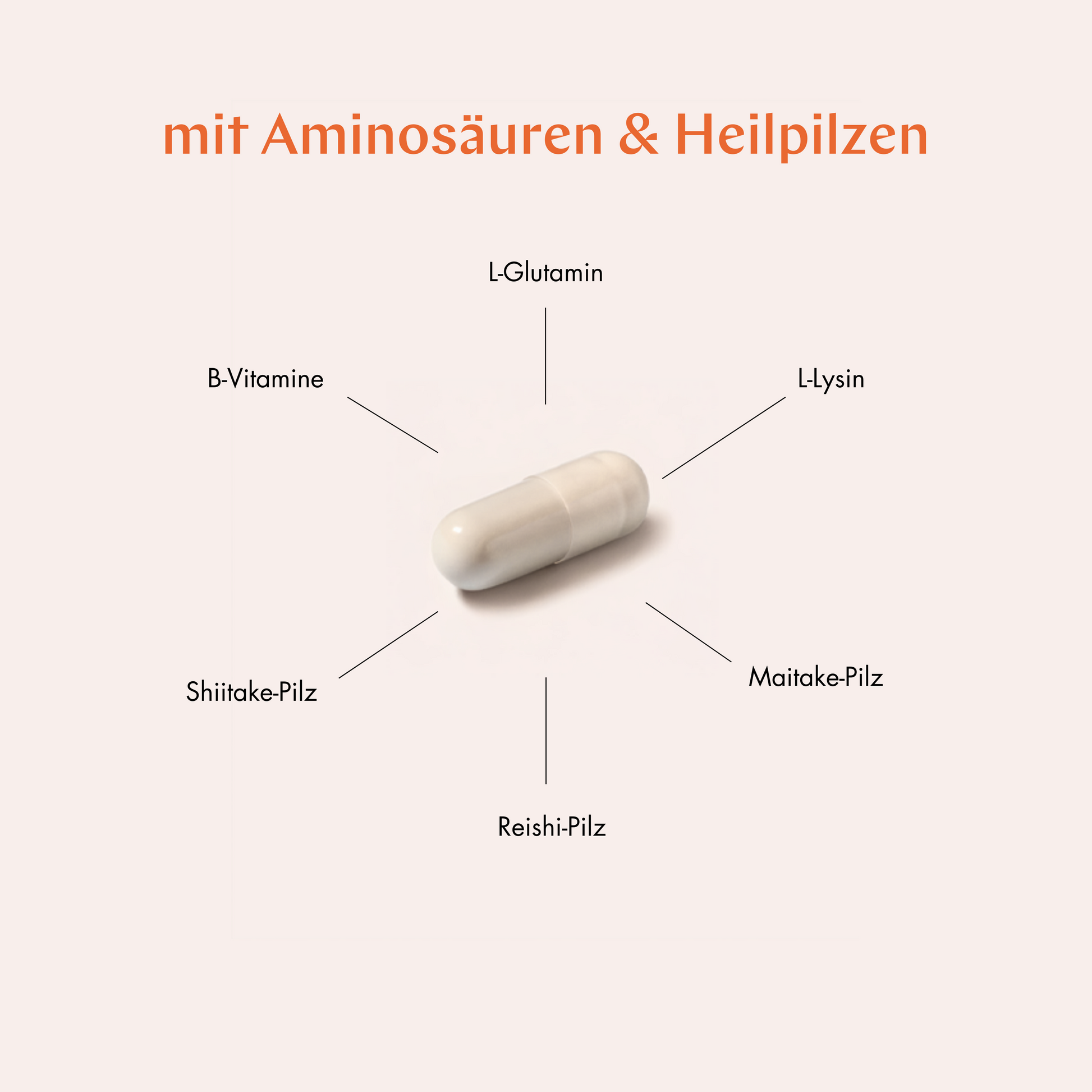 Der Unterschied liegt im Zusammenspiel aus adaptogenen Heilpilzen (Maitake, Reishi, Shiitake), zellschützenden Aminosäuren (L-Glutamin, L-Lysin) und einem vollständigen B-Vitamin-Komplex – für tiefgreifende Erholung, Regeneration auf Zellebene und nachhaltige Energie.