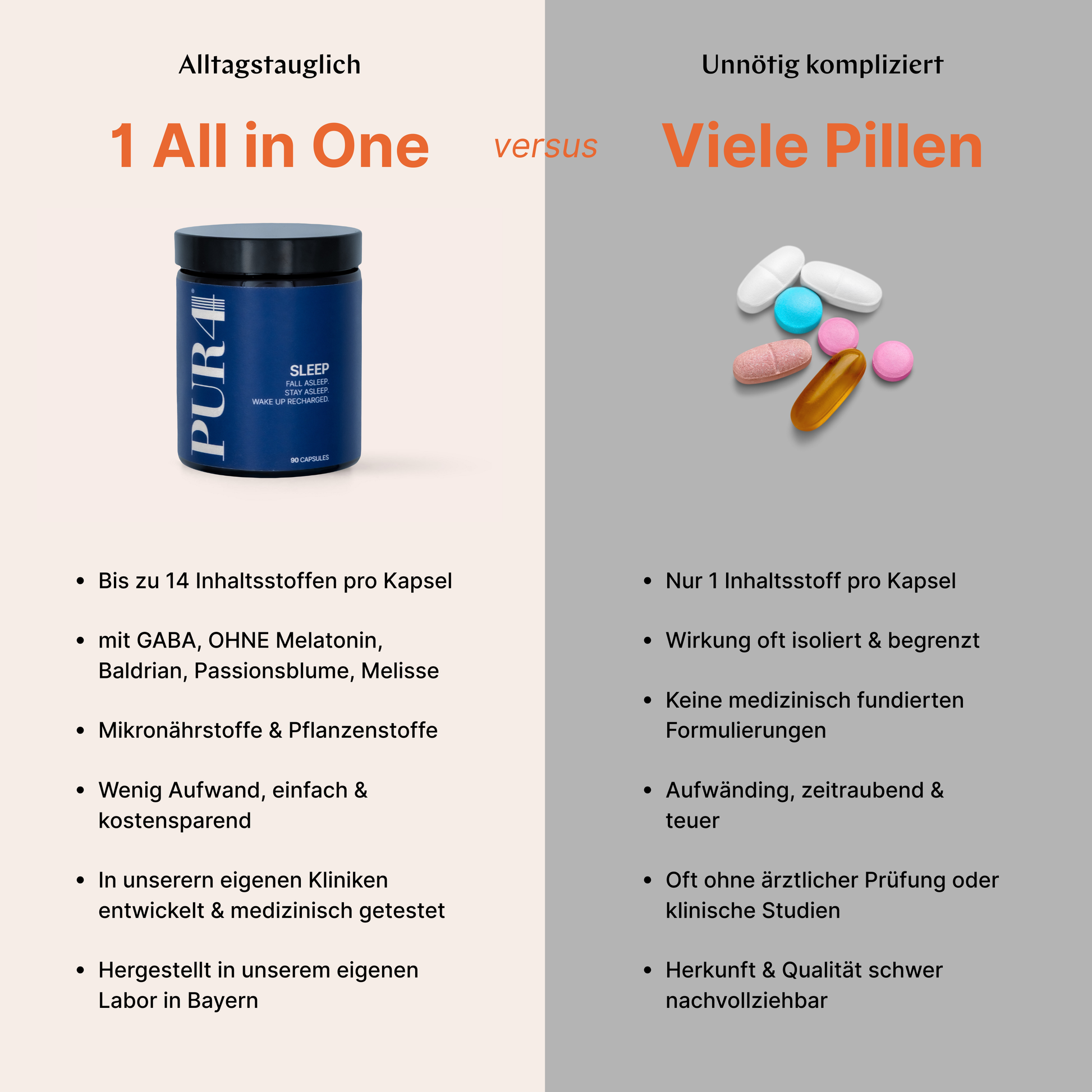 Ja, PUR4 SLEEP kann bei Schlaflosigkeit helfen. In welchem Ausmaß hängt allerdings davon ab, woher Ihre Schlaflosigkeit rührt. Was PUR4 SLEEP allerdings nicht kann, ist die Gründe für Ihre Schlaflosigkeit zu beseitigen.
