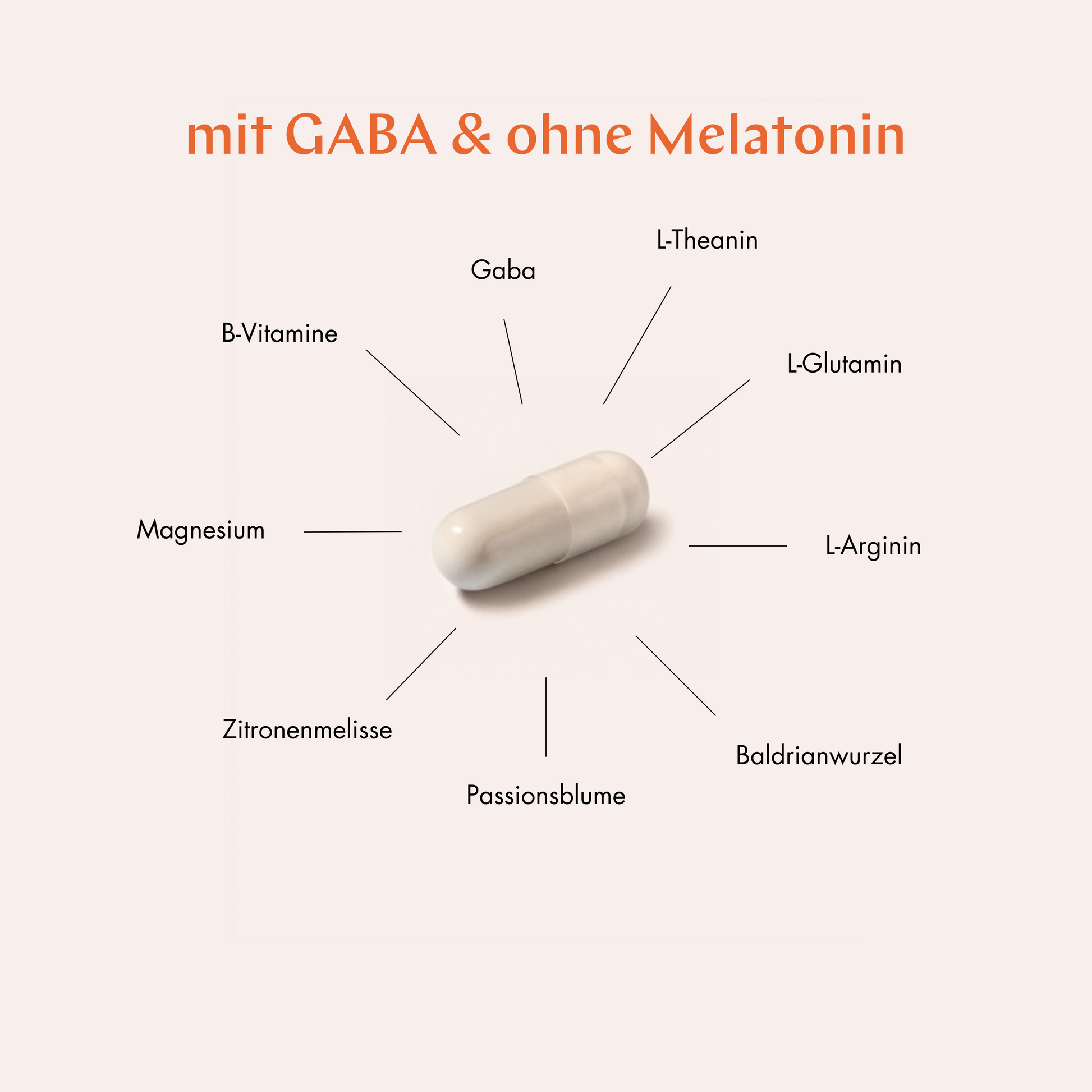 Die Kombination aus GABA, L-Theanin, L-Glutamin und L-Arginin wirkt gezielt auf das zentrale Nervensystem. GABA ist dabei der Schlüssel: Als beruhigender Neurotransmitter hilft es, das Gedankenkarussell zu stoppen und die neuronale Aktivität runterzufahren – ein zentraler Hebel bei stressbedingten Einschlafproblemen. In Kombination mit L-Theanin kann die Wirkung im Gehirn verstärkt und nachhaltig stabilisiert werden.